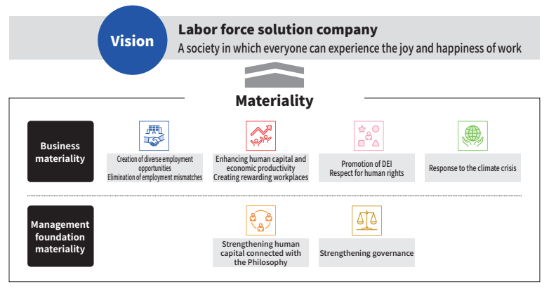 We identified our materiality in the fiscal year ended February 2023, and have been continuously reviewing it based on trends in the international community and feedback from stakeholders. During the fiscal year ended February 2024, we took up the impact of advances in AI and other technologies on the labor market in Japan as an important issue and reviewed our materiality. In the discussion, we examined the impact of advances in AI on the changes in the structure of labor markets, the creation and loss of job opportunities, the changes in behavior of job seekers and companies, and our business operations and the value we provide, and other issues. As a result, we have not changed the materiality items themselves, but we redefined the details of existing items and incorporated them into our medium-term management plan 'dip30th.'