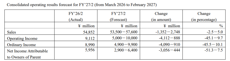 Operating results forecast for FY’27/2(from March 1, 2026 to February 28, 2027)