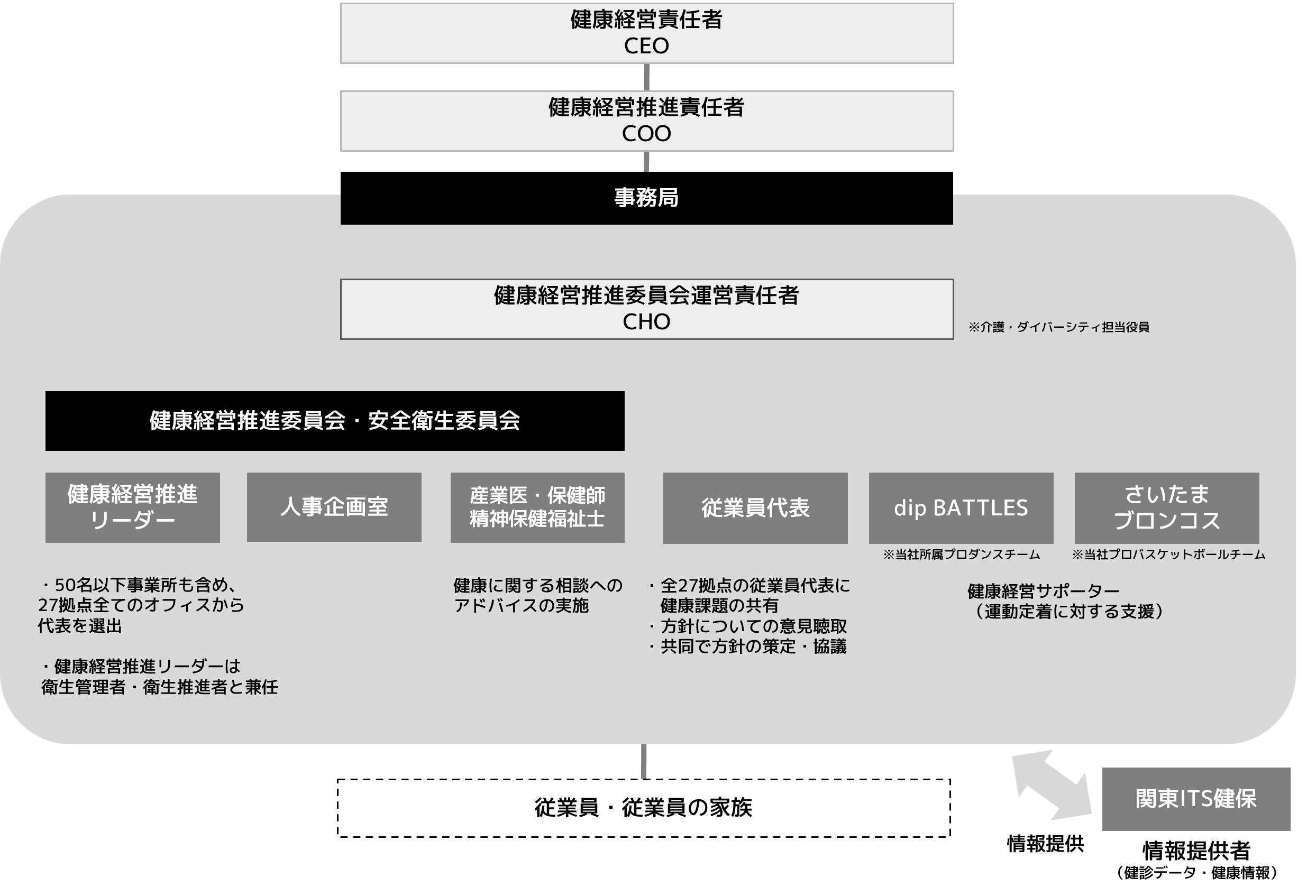 代表取締役社長 兼 CEOを健康経営責任者、代表取締役COOを健康経営推進責任者とし、直下に健康経営推進委員会 兼 衛生委員会(運営責任者執行役員CHO) を設置しています。本委員会では、当社で働くすべての従業員が労働により健康を損なうことがないよう、毎月職場環境・健康に関する様々な課題を中心に話し合いを行っています。なお、同委員会での議論内容については、定期的に取締役会・経営会議に報告を行い経営者に提言する役割も担っています。また、従業員からの意見を反映した健康経営の取り組みとなることを目的に、各拠点から同委員会一員として「健康経営推進リーダー」を任命しております。