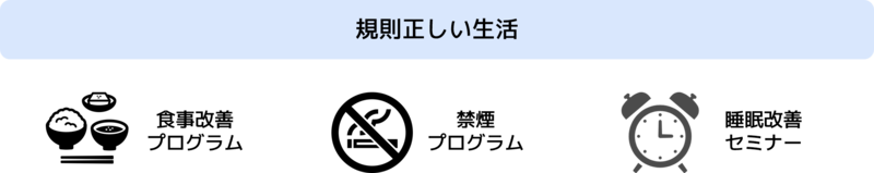 健康に意識を向け、自身のコンディションを知り、改善に向けた行動を起こした際に、継続のための環境作りは重要です。管理職とのコミュニケーションをベースに、健康の維持・増進が図れる取り組みを行っています。