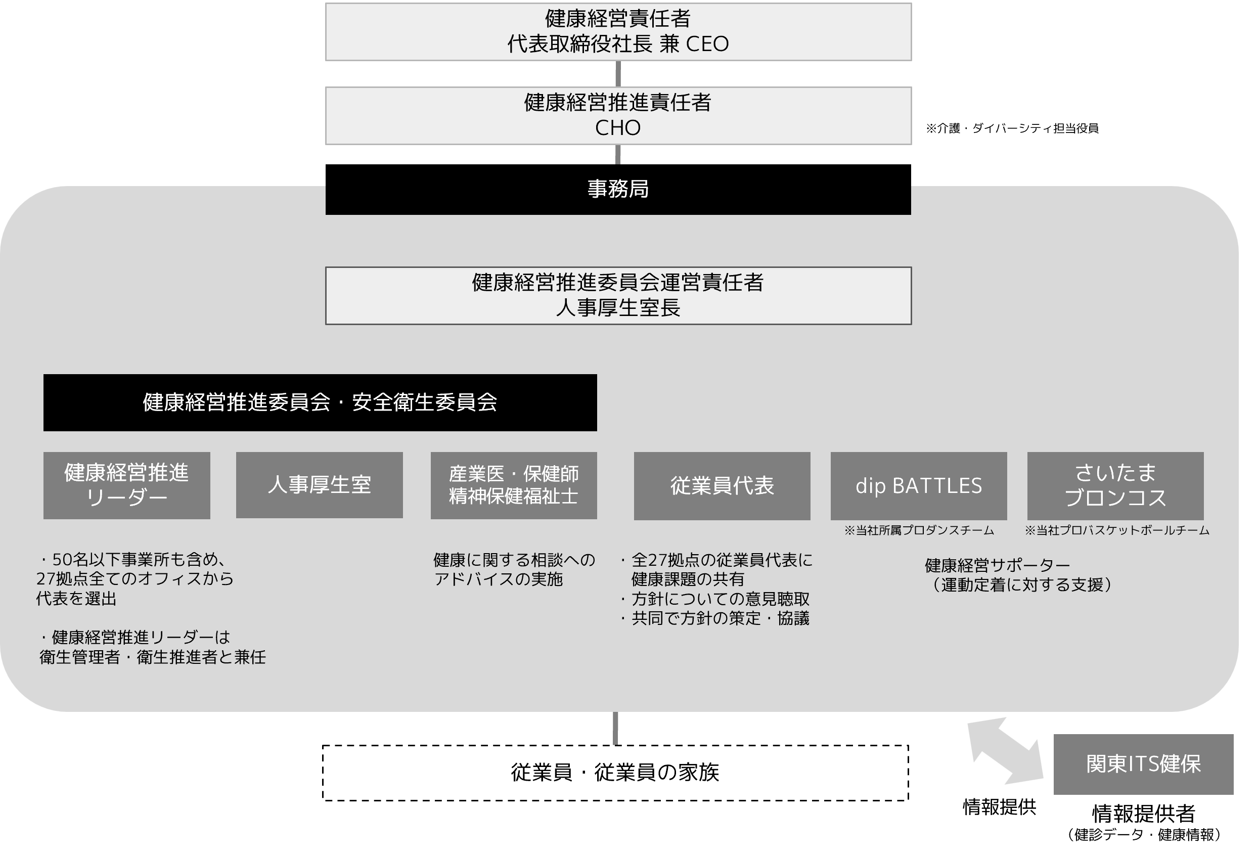 代表取締役社長 兼 CEOを健康経営責任者、CHOを健康経営推進責任者とし、直下に健康経営推進委員会 兼 衛生委員会(運営責任者:人事厚生室長) を設置しています。本委員会では、当社で働くすべての従業員が労働により健康を損なうことがないよう、毎月職場環境・健康に関する様々な課題を中心に話し合いを行っています。なお、同委員会での議論内容については、定期的に取締役会・経営会議に報告を行い経営者に提言する役割も担っています。また、従業員からの意見を反映した健康経営の取り組みとなることを目的に、各拠点から同委員会一員として「健康経営推進リーダー」を任命しております。