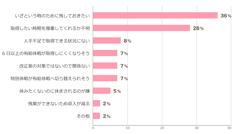 一方、反対した理由として、「いざという時のために残しておきたい」36%が最多となり、次いで「上司が取得したい時季を尊重してくれるか不明」28%と、有給休暇取得の自由度への不安が上位に挙がりました。(Q5)