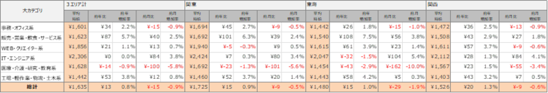 各エリアの平均時給について、関東エリアは1,725円(前年比15円増、前月比9円減)、東海エリアは1,480円(前年比15円増、前月比29円減)、関西エリアは1,526円(前年比20円増、前月比9円減)となりました。